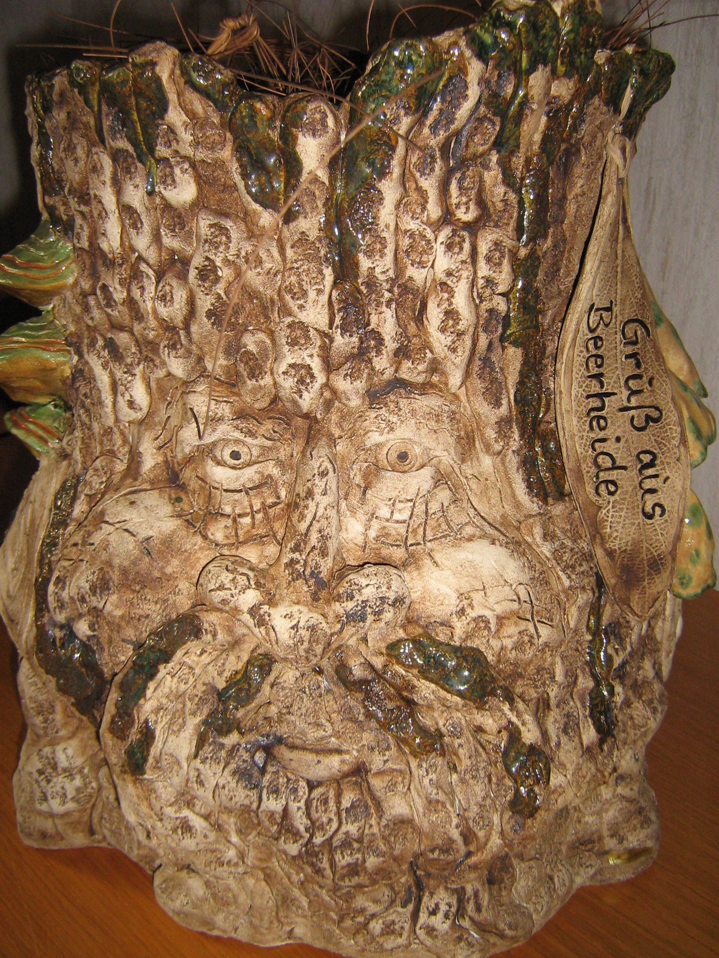 Geschenk: Tongefäß in Gestalt eines Baumes mit freundlich dreinschauendem Gesicht