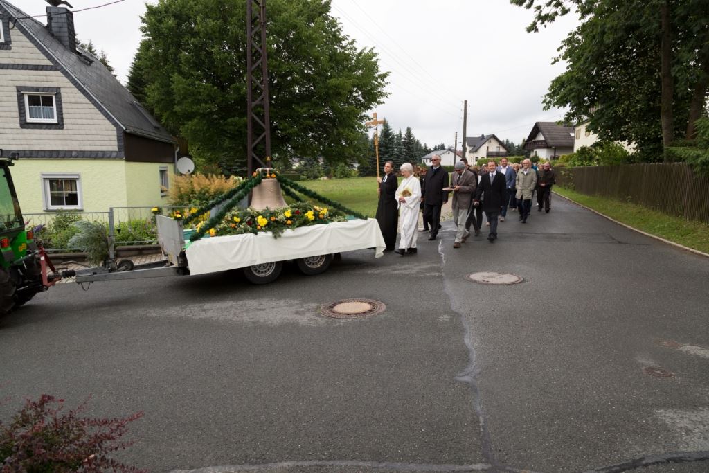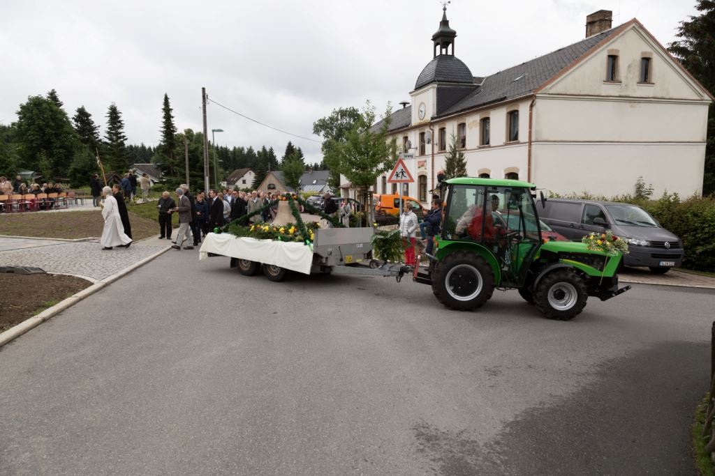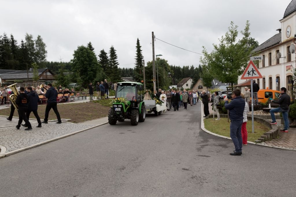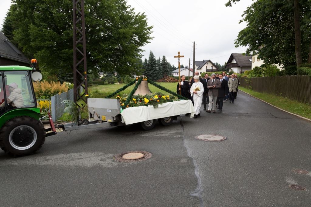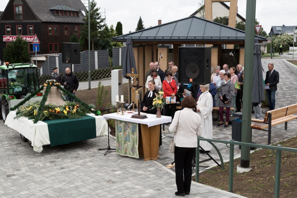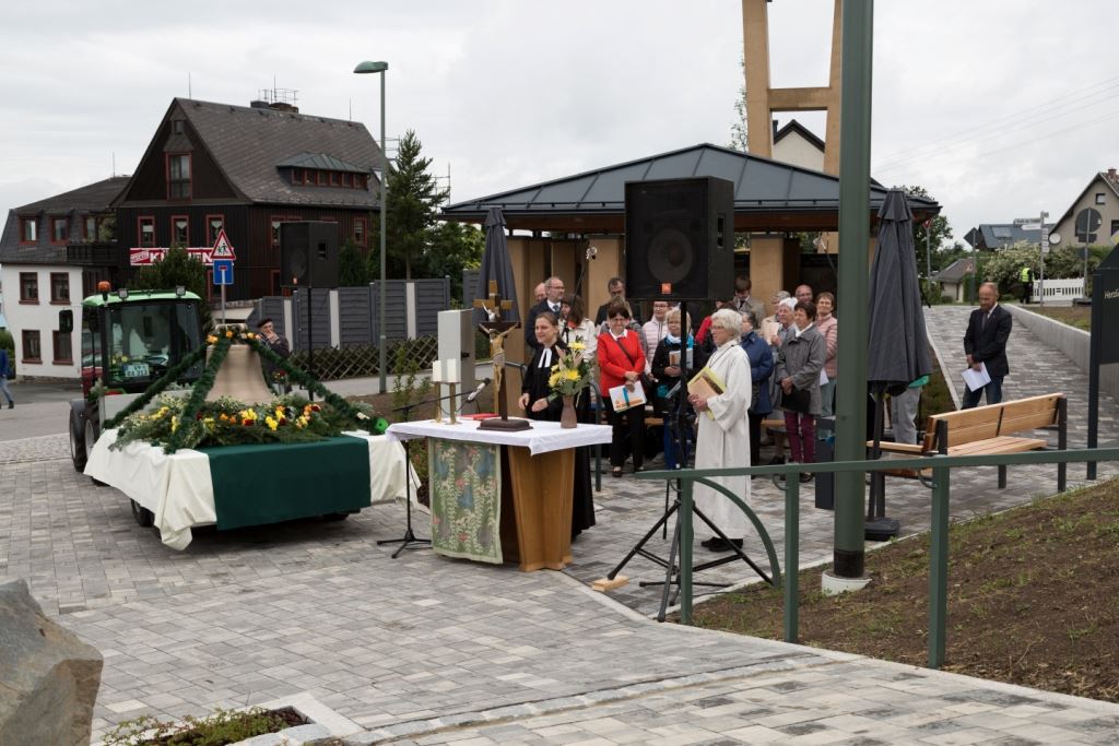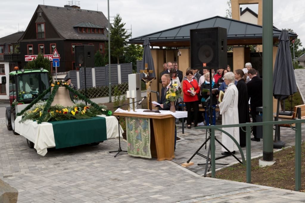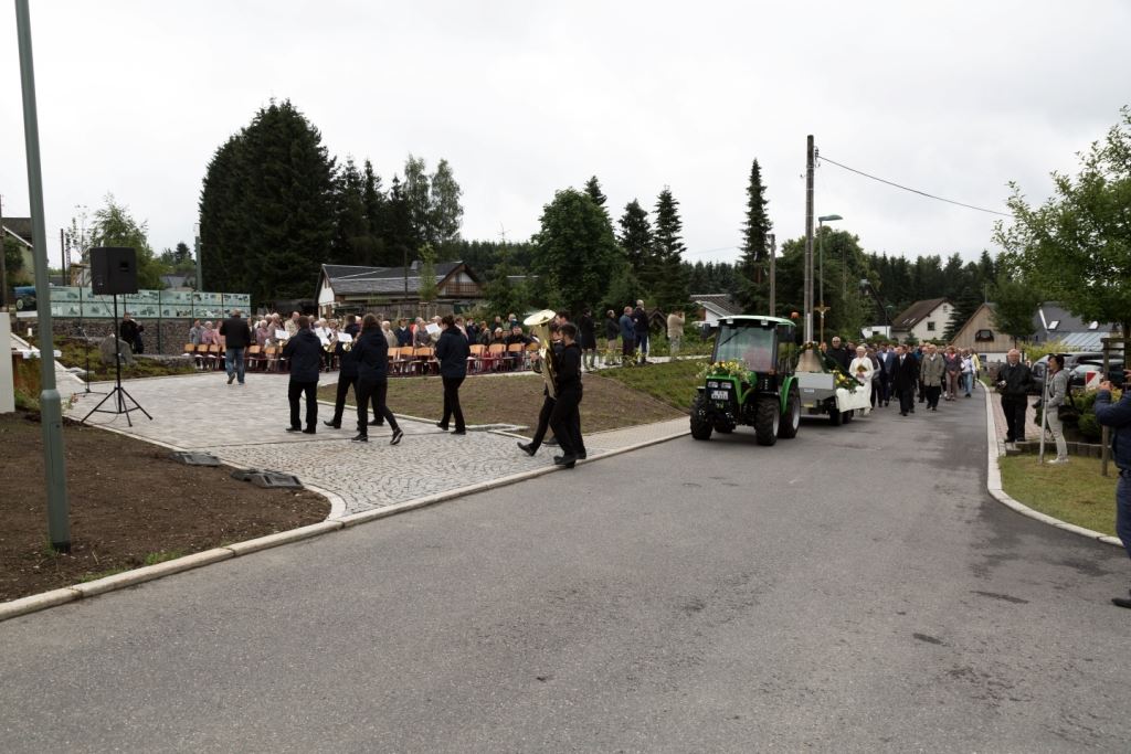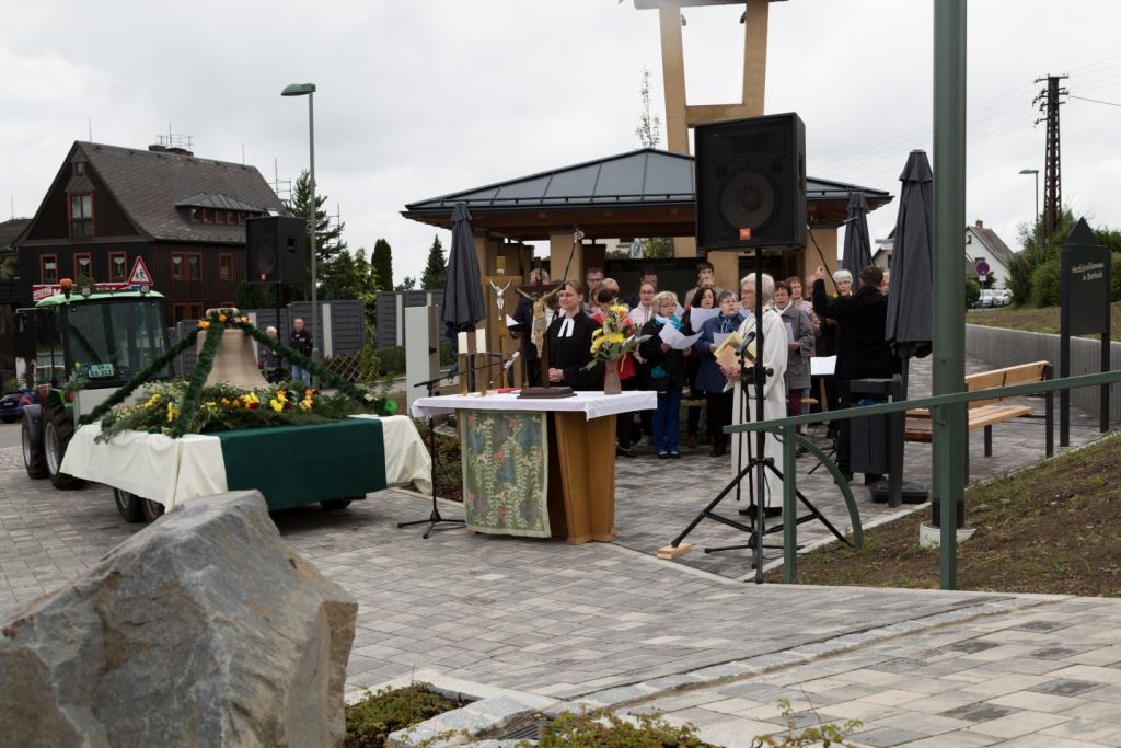 Am Sonntag, dem 24. Juni fand als Höhepunkt der Feierlichkeiten zum Partnerschaftstreffen ein Festumzug und Ökumenischer Open-Air-Gottesdienst mit Weihe der Beerheider Glocke statt. Betreiber dieser Glocke wird die Evangelische St.-Laurentius-Kirchgemeinde Auerbach sein. Ein herzlicher Dank geht an all diejenigen, die diesen Tag vorbereitet und durchgeführt haben; zu danken ist unserer Stadt Auerbach mit Stadtrat und Stadtverwaltung für die Unterstützung beim Bau und der Einweihung des Ortsplatzes, der Evangelischen und Katholischen Kirchgemeinde zu Auerbach mit Frau Pfrn. Dr. Schmutzler und Frau Mahler sowie dem Kirchen- und Posaunenchor unter Leitung von Herrn KMD Meier für die Ausgestaltung des Gottesdienstes, dem Jugendblasorchester Auerbach unter Leitung von Andreas Schmidt für die Mitwirkung beim Festumzug, den städtischen Mitarbeitern im Bauhof, dem Ordnungsamt und dem Bereich Marktwesen sowie allen im Vorfeld beteiligten Verwaltungsmitarbeitern- besonders im Bereich Bauwesen und Finanzen. Ein besonderer Dank geht an die zahlreichen ehrenamtlichen Mitstreiter, die aus Beerheide von der Kirchgemeinde und der Landeskirchlichen Gemeinschaft zusammen mit dem Ortschaftsrat diesen Festtag geplant, vorbereitet und gestaltet haben. Danke auch allen Besuchern, die als Gäste begrüßt werden konnten – so kamen neben den Freunden aus der Partnergemeinde zur Beerheider Ortsplatzeinweihung auch die vogtländische Bundestagsabgeordnete Yvonne Magwas, der Landtagsabgeordnete unseres Wahlkreises Sören Voigt, der Stellvertreter des Oberbürgermeisters unserer Stadt Auerbach Joachim Otto sowie mehrere Stadträte, Vertreter der Stadtverwaltung, des Kirchenvorstandes der St.-Laurentiuskirchgemeinde Auerbach, Mitglieder der Beerheider Vereine und Interessengemeinschaften und zahlreiche weitere Einwohner aus unserer Ortschaft sowie Gäste aus Auerbach und aus den Nachbargemeinden.