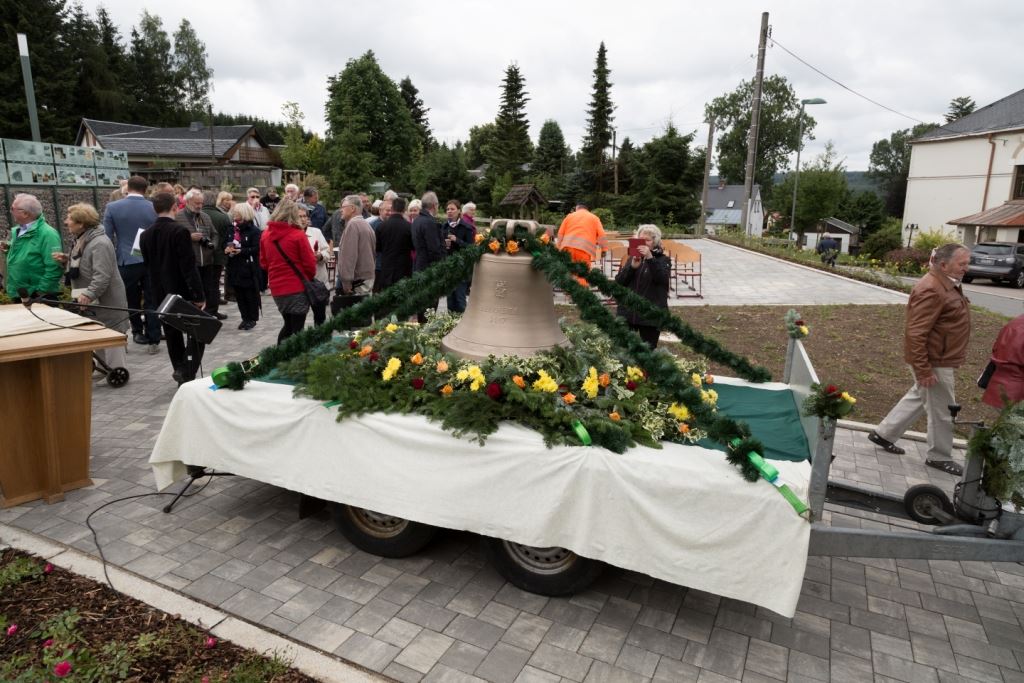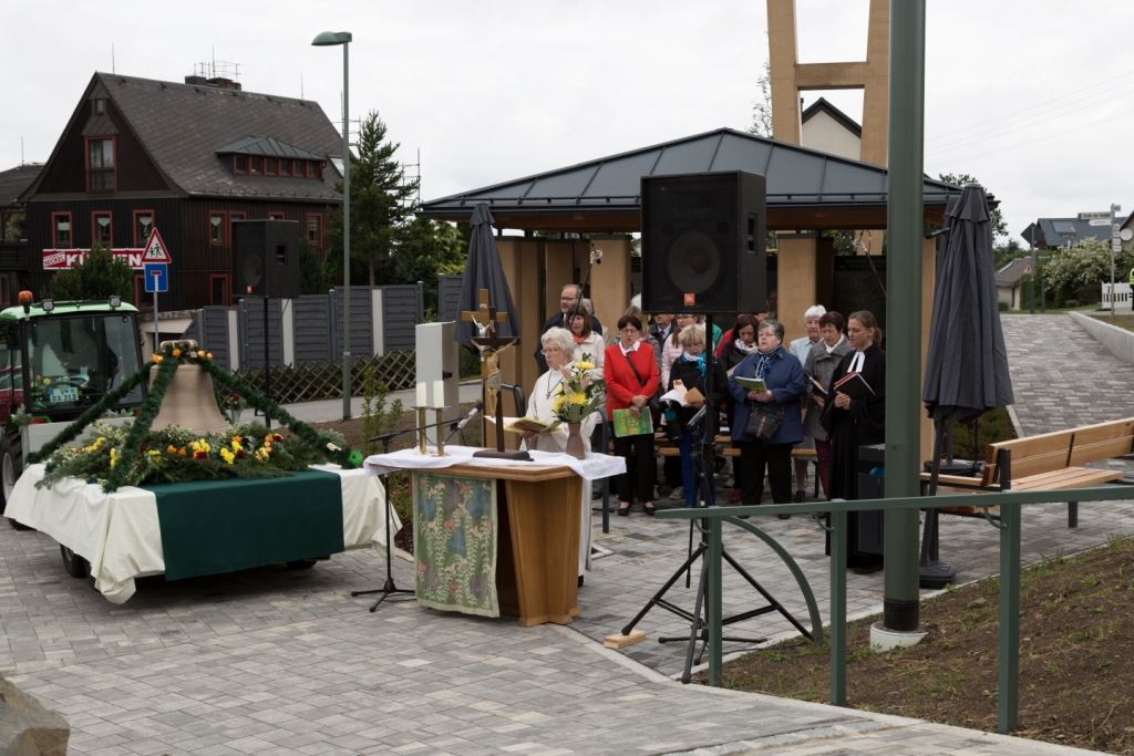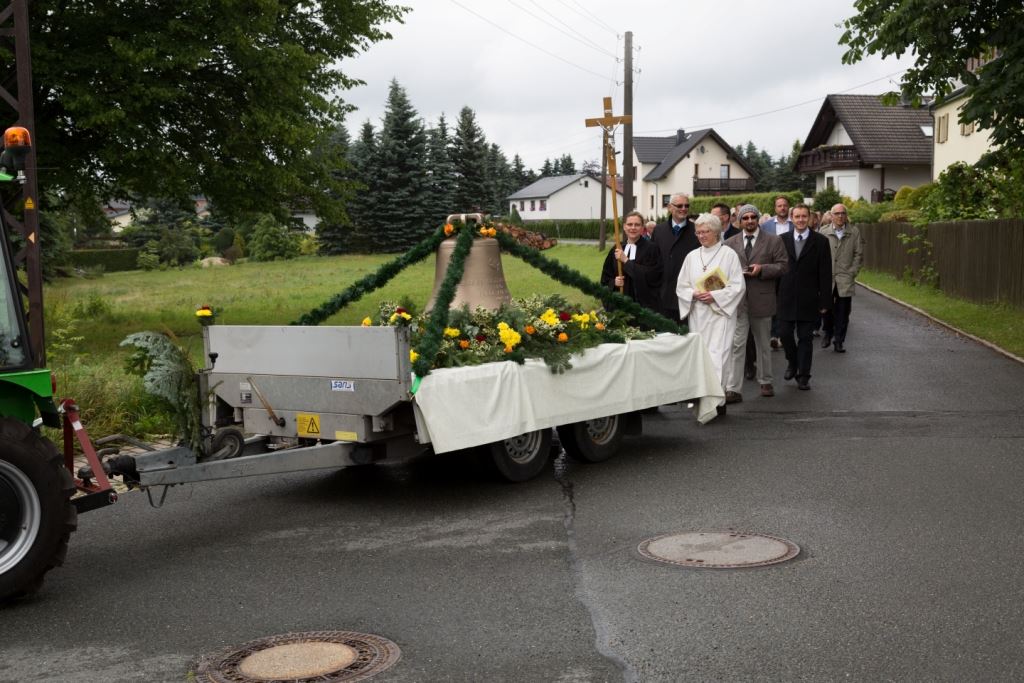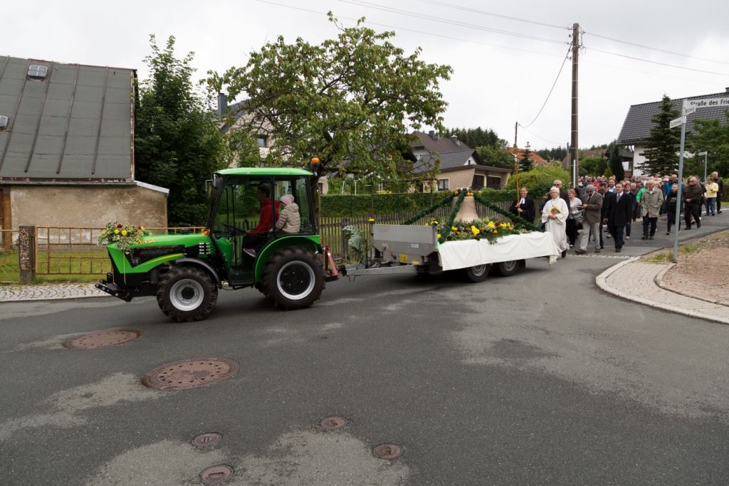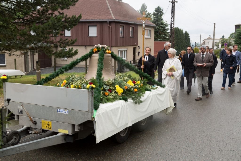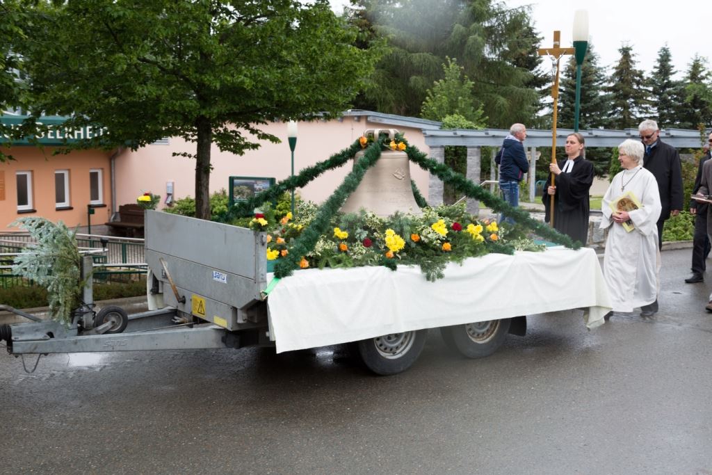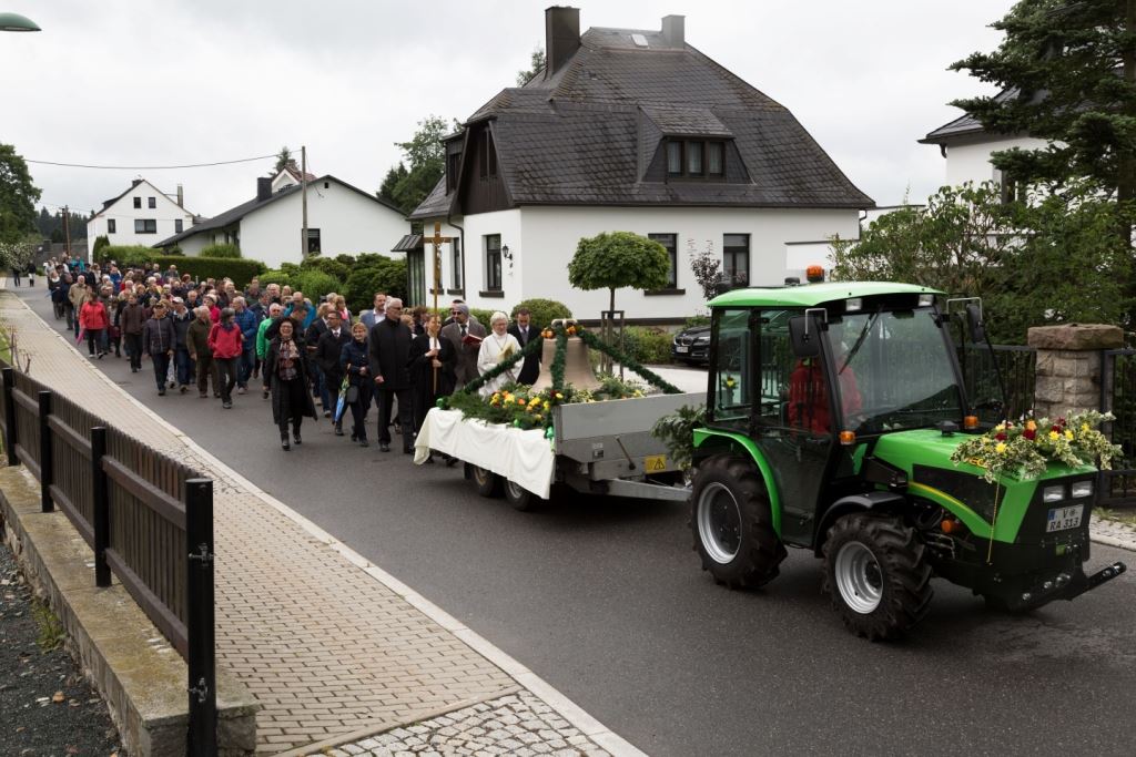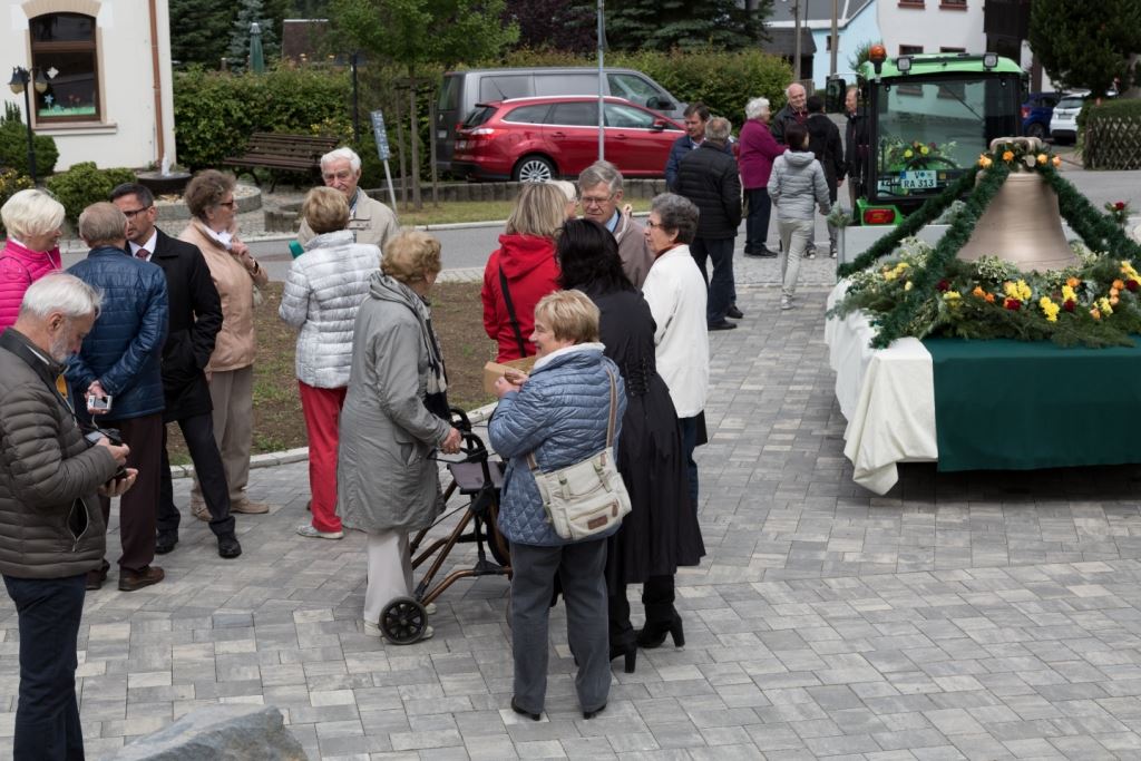 Am Sonntag, dem 24. Juni fand als Höhepunkt der Feierlichkeiten zum Partnerschaftstreffen ein Festumzug und Ökumenischer Open-Air-Gottesdienst mit Weihe der Beerheider Glocke statt. Betreiber dieser Glocke wird die Evangelische St.-Laurentius-Kirchgemeinde Auerbach sein. Ein herzlicher Dank geht an all diejenigen, die diesen Tag vorbereitet und durchgeführt haben; zu danken ist unserer Stadt Auerbach mit Stadtrat und Stadtverwaltung für die Unterstützung beim Bau und der Einweihung des Ortsplatzes, der Evangelischen und Katholischen Kirchgemeinde zu Auerbach mit Frau Pfrn. Dr. Schmutzler und Frau Mahler sowie dem Kirchen- und Posaunenchor unter Leitung von Herrn KMD Meier für die Ausgestaltung des Gottesdienstes, dem Jugendblasorchester Auerbach unter Leitung von Andreas Schmidt für die Mitwirkung beim Festumzug, den städtischen Mitarbeitern im Bauhof, dem Ordnungsamt und dem Bereich Marktwesen sowie allen im Vorfeld beteiligten Verwaltungsmitarbeitern- besonders im Bereich Bauwesen und Finanzen. Ein besonderer Dank geht an die zahlreichen ehrenamtlichen Mitstreiter, die aus Beerheide von der Kirchgemeinde und der Landeskirchlichen Gemeinschaft zusammen mit dem Ortschaftsrat diesen Festtag geplant, vorbereitet und gestaltet haben. Danke auch allen Besuchern, die als Gäste begrüßt werden konnten – so kamen neben den Freunden aus der Partnergemeinde zur Beerheider Ortsplatzeinweihung auch die vogtländische Bundestagsabgeordnete Yvonne Magwas, der Landtagsabgeordnete unseres Wahlkreises Sören Voigt, der Stellvertreter des Oberbürgermeisters unserer Stadt Auerbach Joachim Otto sowie mehrere Stadträte, Vertreter der Stadtverwaltung, des Kirchenvorstandes der St.-Laurentiuskirchgemeinde Auerbach, Mitglieder der Beerheider Vereine und Interessengemeinschaften und zahlreiche weitere Einwohner aus unserer Ortschaft sowie Gäste aus Auerbach und aus den Nachbargemeinden.