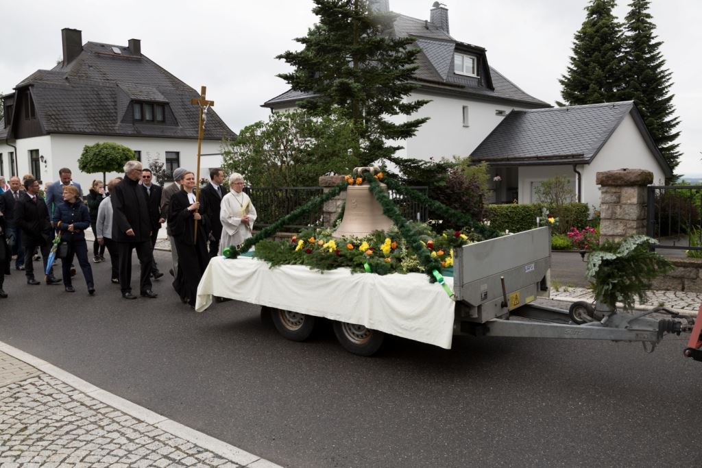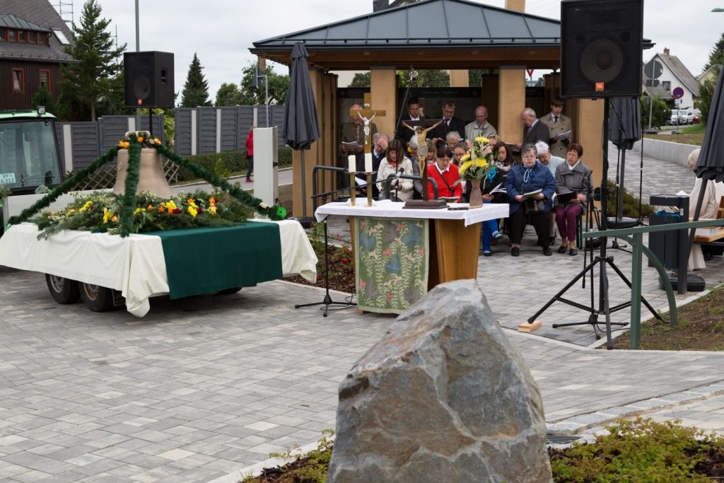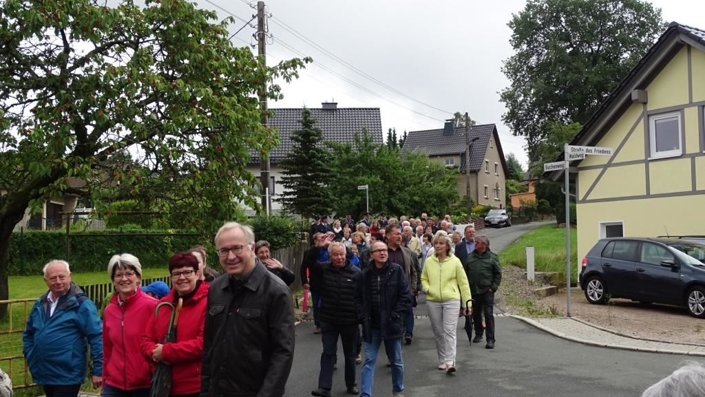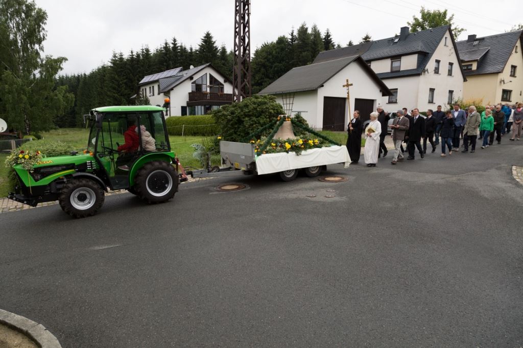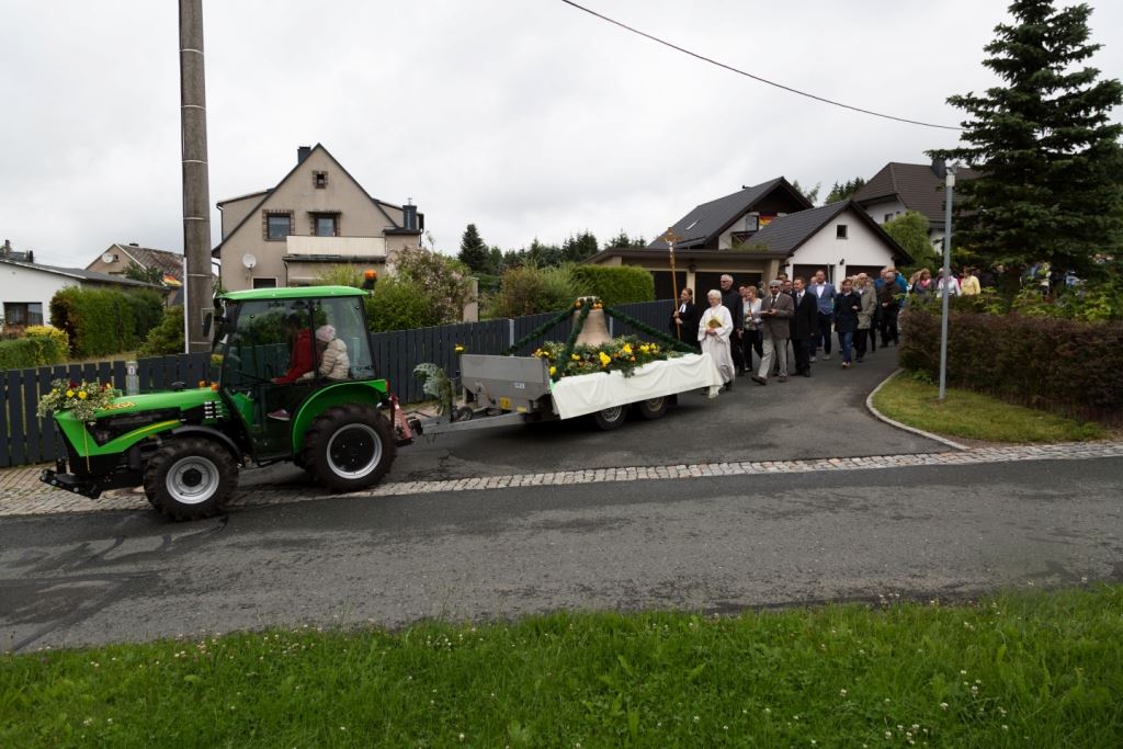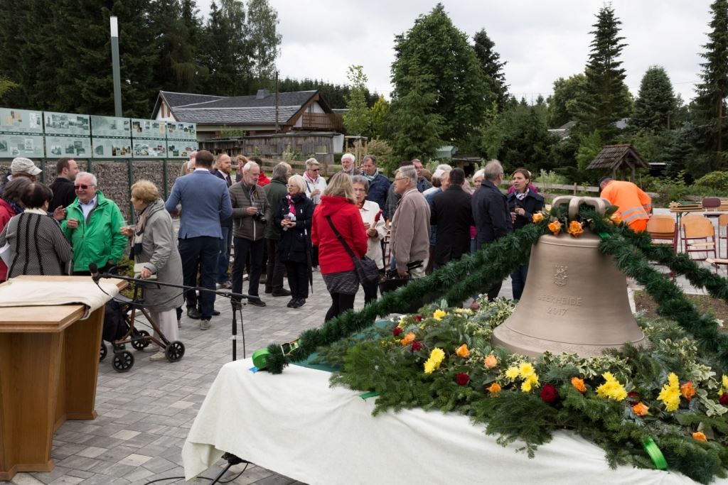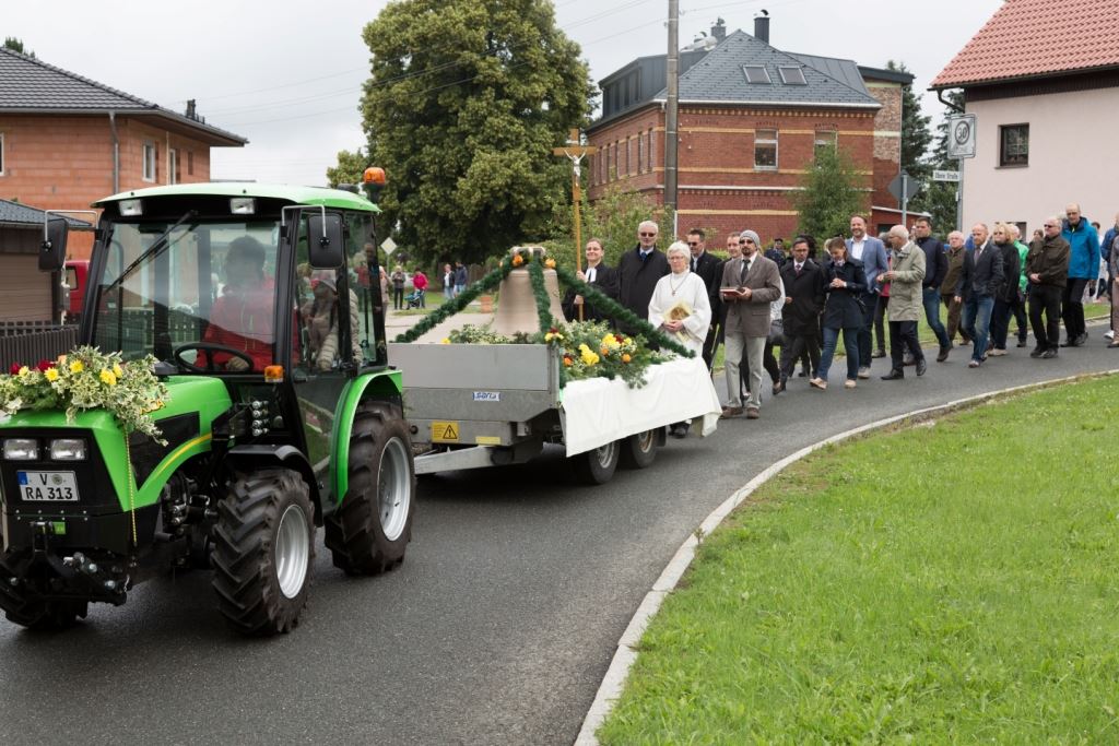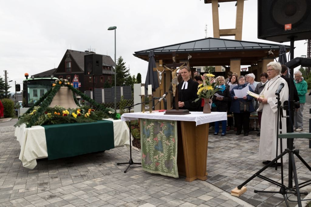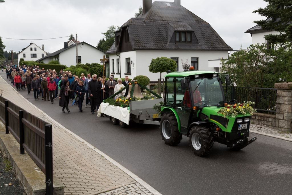 Am Sonntag, dem 24. Juni fand als Höhepunkt der Feierlichkeiten zum Partnerschaftstreffen ein Festumzug und Ökumenischer Open-Air-Gottesdienst mit Weihe der Beerheider Glocke statt. Betreiber dieser Glocke wird die Evangelische St.-Laurentius-Kirchgemeinde Auerbach sein. Ein herzlicher Dank geht an all diejenigen, die diesen Tag vorbereitet und durchgeführt haben; zu danken ist unserer Stadt Auerbach mit Stadtrat und Stadtverwaltung für die Unterstützung beim Bau und der Einweihung des Ortsplatzes, der Evangelischen und Katholischen Kirchgemeinde zu Auerbach mit Frau Pfrn. Dr. Schmutzler und Frau Mahler sowie dem Kirchen- und Posaunenchor unter Leitung von Herrn KMD Meier für die Ausgestaltung des Gottesdienstes, dem Jugendblasorchester Auerbach unter Leitung von Andreas Schmidt für die Mitwirkung beim Festumzug, den städtischen Mitarbeitern im Bauhof, dem Ordnungsamt und dem Bereich Marktwesen sowie allen im Vorfeld beteiligten Verwaltungsmitarbeitern- besonders im Bereich Bauwesen und Finanzen. Ein besonderer Dank geht an die zahlreichen ehrenamtlichen Mitstreiter, die aus Beerheide von der Kirchgemeinde und der Landeskirchlichen Gemeinschaft zusammen mit dem Ortschaftsrat diesen Festtag geplant, vorbereitet und gestaltet haben. Danke auch allen Besuchern, die als Gäste begrüßt werden konnten – so kamen neben den Freunden aus der Partnergemeinde zur Beerheider Ortsplatzeinweihung auch die vogtländische Bundestagsabgeordnete Yvonne Magwas, der Landtagsabgeordnete unseres Wahlkreises Sören Voigt, der Stellvertreter des Oberbürgermeisters unserer Stadt Auerbach Joachim Otto sowie mehrere Stadträte, Vertreter der Stadtverwaltung, des Kirchenvorstandes der St.-Laurentiuskirchgemeinde Auerbach, Mitglieder der Beerheider Vereine und Interessengemeinschaften und zahlreiche weitere Einwohner aus unserer Ortschaft sowie Gäste aus Auerbach und aus den Nachbargemeinden.