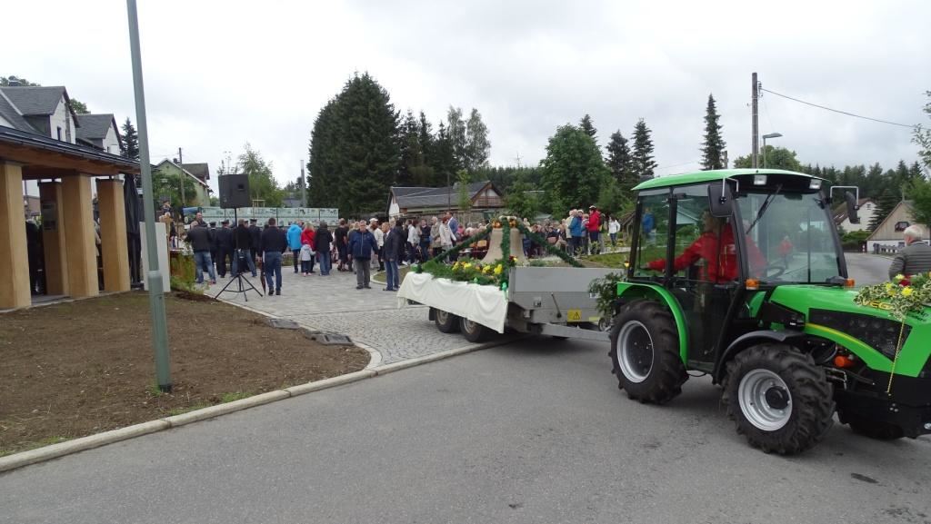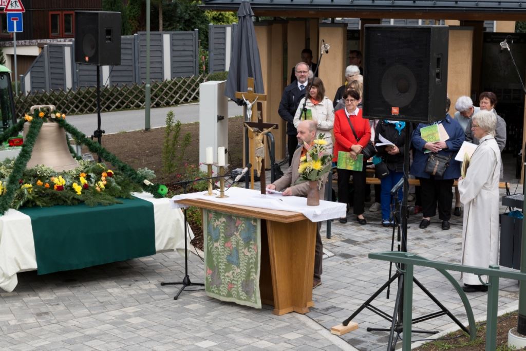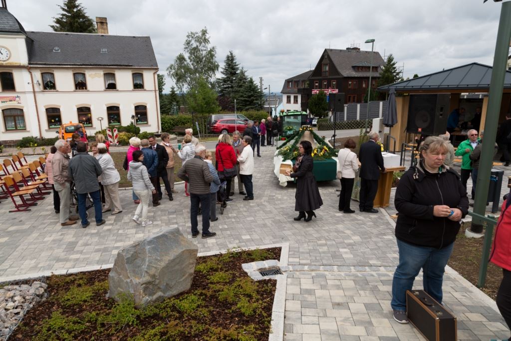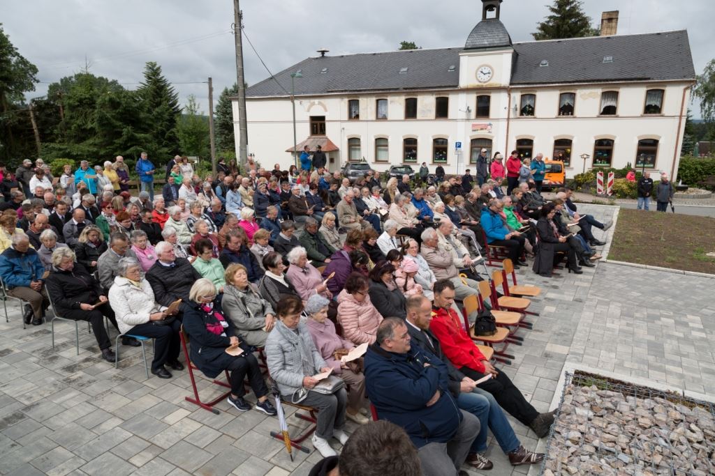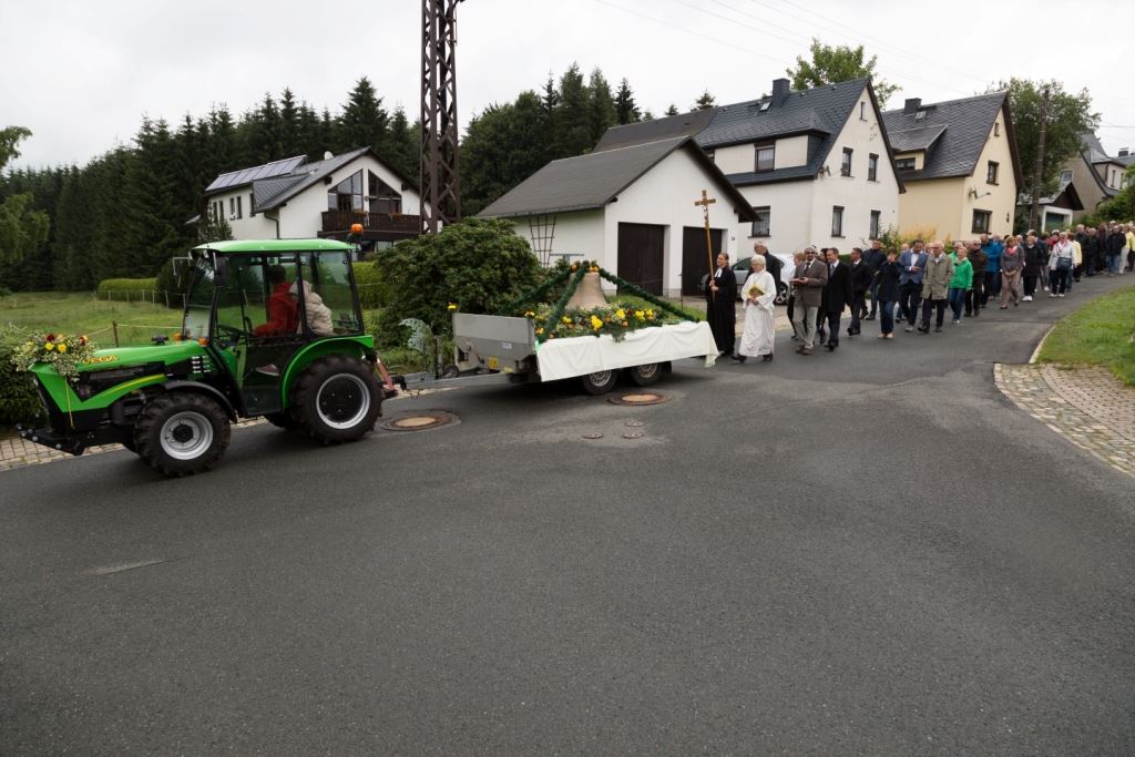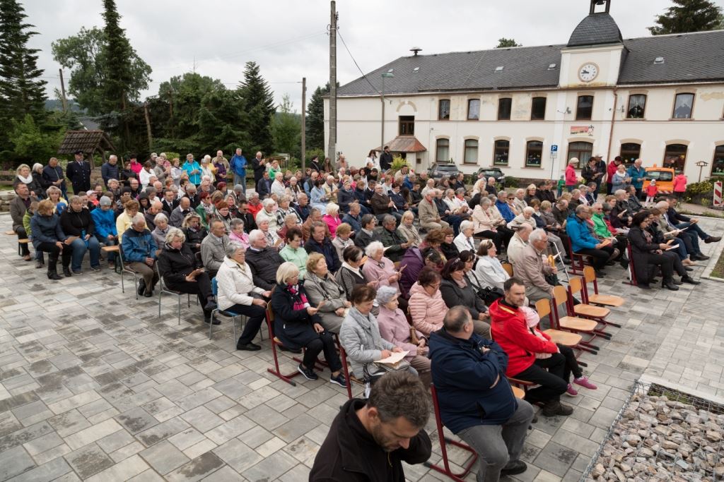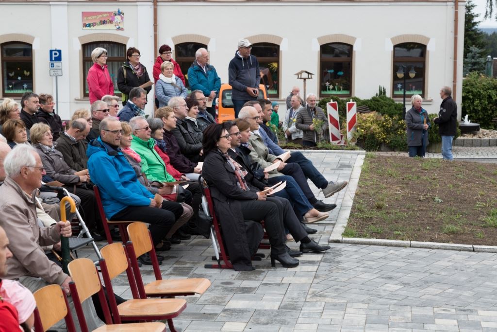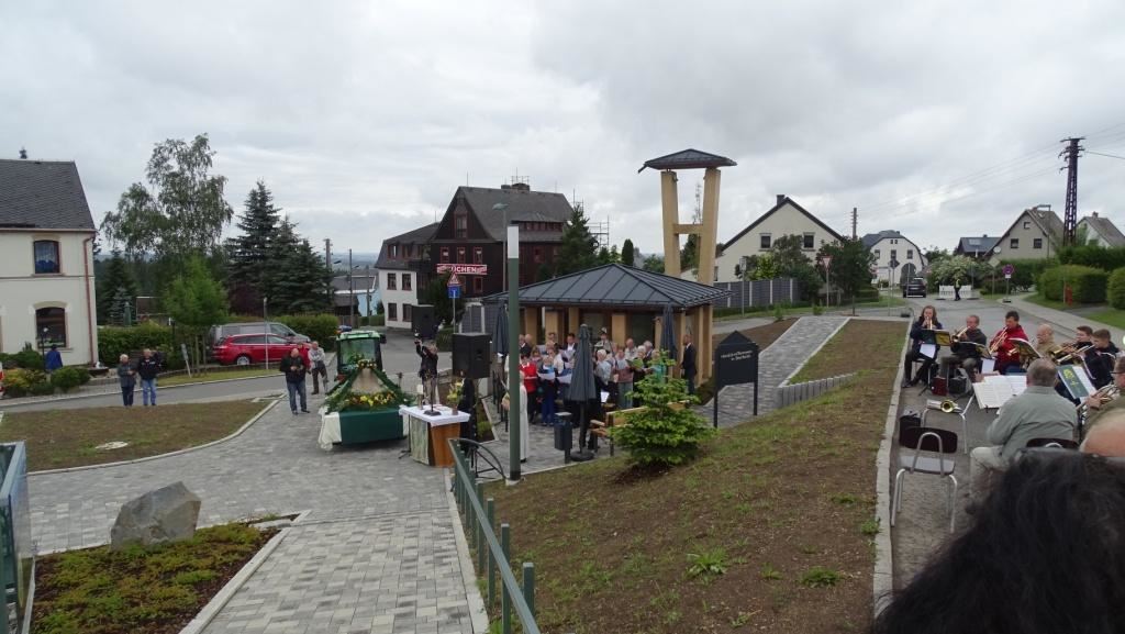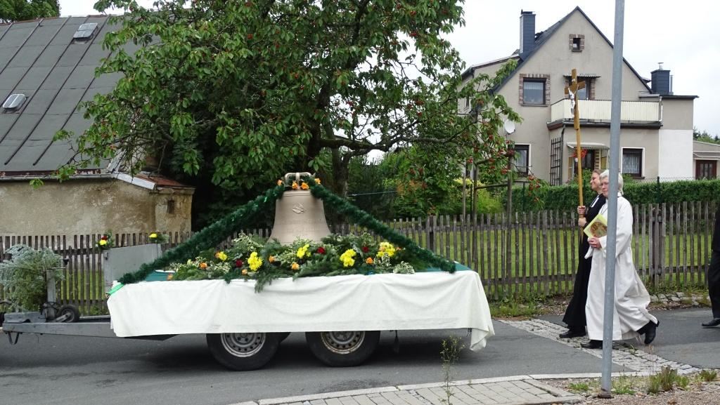 Am Sonntag, dem 24. Juni fand als Höhepunkt der Feierlichkeiten zum Partnerschaftstreffen ein Festumzug und Ökumenischer Open-Air-Gottesdienst mit Weihe der Beerheider Glocke statt. Betreiber dieser Glocke wird die Evangelische St.-Laurentius-Kirchgemeinde Auerbach sein. Ein herzlicher Dank geht an all diejenigen, die diesen Tag vorbereitet und durchgeführt haben; zu danken ist unserer Stadt Auerbach mit Stadtrat und Stadtverwaltung für die Unterstützung beim Bau und der Einweihung des Ortsplatzes, der Evangelischen und Katholischen Kirchgemeinde zu Auerbach mit Frau Pfrn. Dr. Schmutzler und Frau Mahler sowie dem Kirchen- und Posaunenchor unter Leitung von Herrn KMD Meier für die Ausgestaltung des Gottesdienstes, dem Jugendblasorchester Auerbach unter Leitung von Andreas Schmidt für die Mitwirkung beim Festumzug, den städtischen Mitarbeitern im Bauhof, dem Ordnungsamt und dem Bereich Marktwesen sowie allen im Vorfeld beteiligten Verwaltungsmitarbeitern- besonders im Bereich Bauwesen und Finanzen. Ein besonderer Dank geht an die zahlreichen ehrenamtlichen Mitstreiter, die aus Beerheide von der Kirchgemeinde und der Landeskirchlichen Gemeinschaft zusammen mit dem Ortschaftsrat diesen Festtag geplant, vorbereitet und gestaltet haben. Danke auch allen Besuchern, die als Gäste begrüßt werden konnten – so kamen neben den Freunden aus der Partnergemeinde zur Beerheider Ortsplatzeinweihung auch die vogtländische Bundestagsabgeordnete Yvonne Magwas, der Landtagsabgeordnete unseres Wahlkreises Sören Voigt, der Stellvertreter des Oberbürgermeisters unserer Stadt Auerbach Joachim Otto sowie mehrere Stadträte, Vertreter der Stadtverwaltung, des Kirchenvorstandes der St.-Laurentiuskirchgemeinde Auerbach, Mitglieder der Beerheider Vereine und Interessengemeinschaften und zahlreiche weitere Einwohner aus unserer Ortschaft sowie Gäste aus Auerbach und aus den Nachbargemeinden.