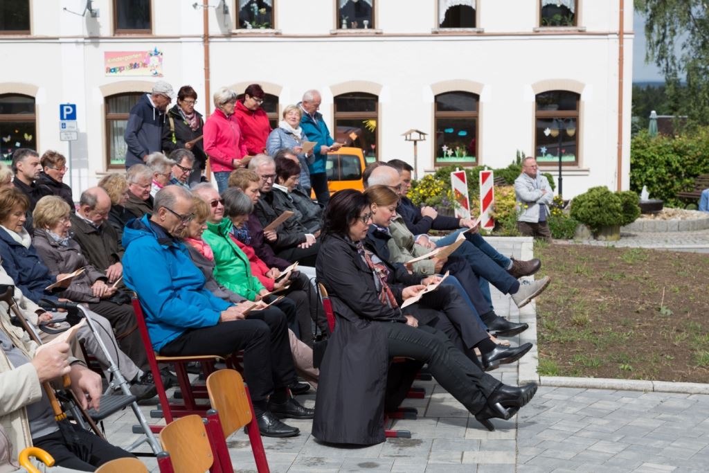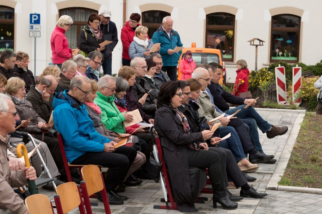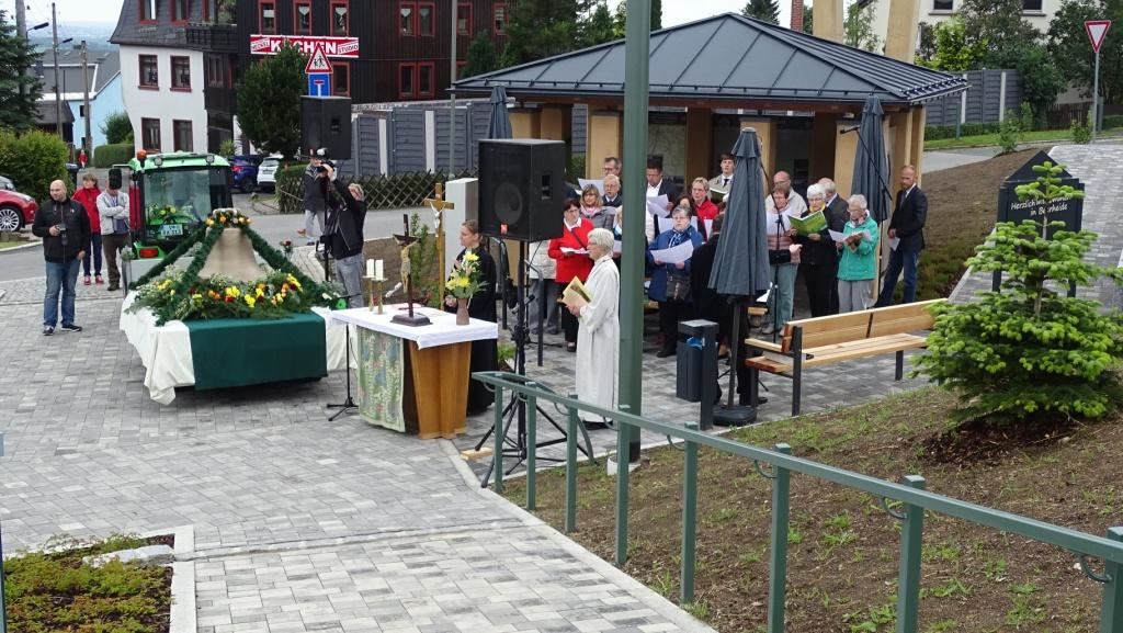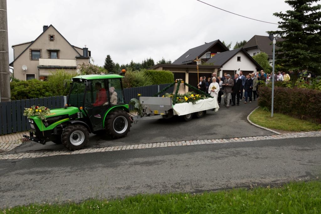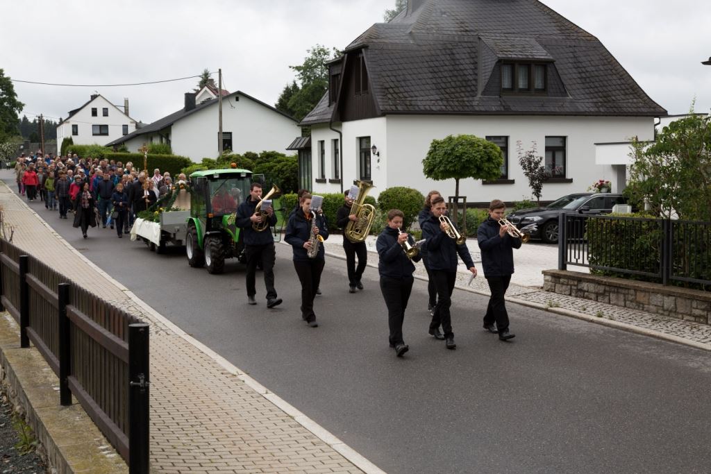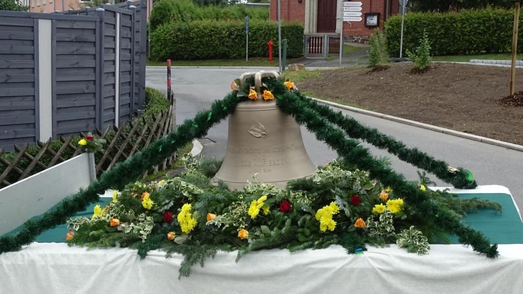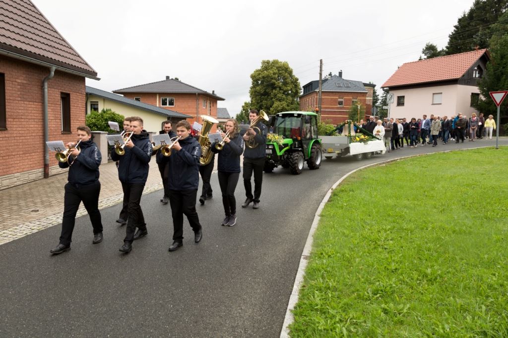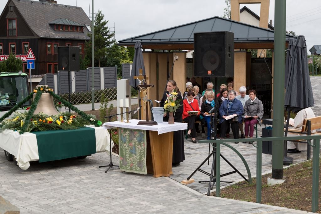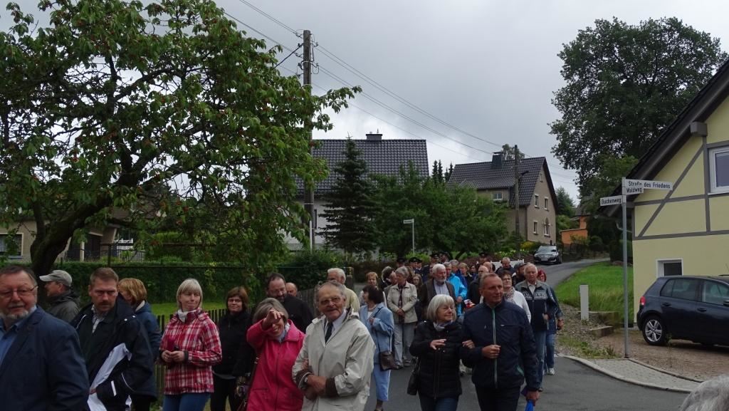 Am Sonntag, dem 24. Juni fand als Höhepunkt der Feierlichkeiten zum Partnerschaftstreffen ein Festumzug und Ökumenischer Open-Air-Gottesdienst mit Weihe der Beerheider Glocke statt. Betreiber dieser Glocke wird die Evangelische St.-Laurentius-Kirchgemeinde Auerbach sein. Ein herzlicher Dank geht an all diejenigen, die diesen Tag vorbereitet und durchgeführt haben; zu danken ist unserer Stadt Auerbach mit Stadtrat und Stadtverwaltung für die Unterstützung beim Bau und der Einweihung des Ortsplatzes, der Evangelischen und Katholischen Kirchgemeinde zu Auerbach mit Frau Pfrn. Dr. Schmutzler und Frau Mahler sowie dem Kirchen- und Posaunenchor unter Leitung von Herrn KMD Meier für die Ausgestaltung des Gottesdienstes, dem Jugendblasorchester Auerbach unter Leitung von Andreas Schmidt für die Mitwirkung beim Festumzug, den städtischen Mitarbeitern im Bauhof, dem Ordnungsamt und dem Bereich Marktwesen sowie allen im Vorfeld beteiligten Verwaltungsmitarbeitern- besonders im Bereich Bauwesen und Finanzen. Ein besonderer Dank geht an die zahlreichen ehrenamtlichen Mitstreiter, die aus Beerheide von der Kirchgemeinde und der Landeskirchlichen Gemeinschaft zusammen mit dem Ortschaftsrat diesen Festtag geplant, vorbereitet und gestaltet haben. Danke auch allen Besuchern, die als Gäste begrüßt werden konnten – so kamen neben den Freunden aus der Partnergemeinde zur Beerheider Ortsplatzeinweihung auch die vogtländische Bundestagsabgeordnete Yvonne Magwas, der Landtagsabgeordnete unseres Wahlkreises Sören Voigt, der Stellvertreter des Oberbürgermeisters unserer Stadt Auerbach Joachim Otto sowie mehrere Stadträte, Vertreter der Stadtverwaltung, des Kirchenvorstandes der St.-Laurentiuskirchgemeinde Auerbach, Mitglieder der Beerheider Vereine und Interessengemeinschaften und zahlreiche weitere Einwohner aus unserer Ortschaft sowie Gäste aus Auerbach und aus den Nachbargemeinden.