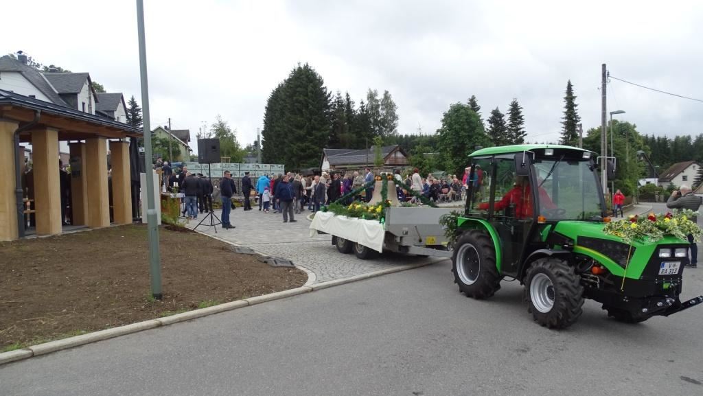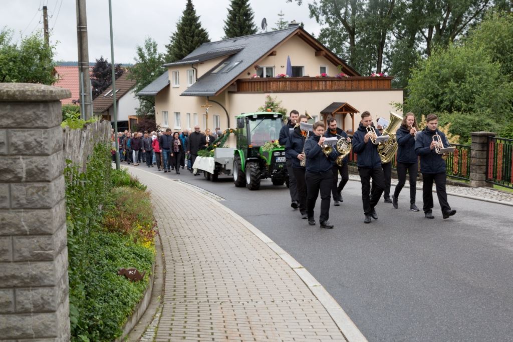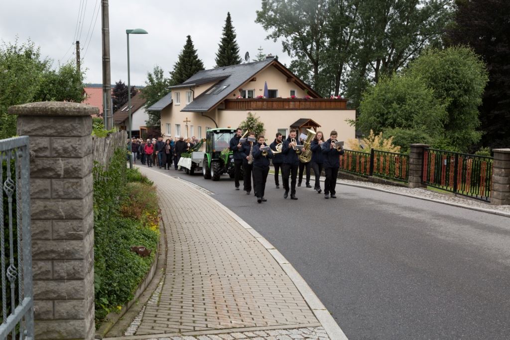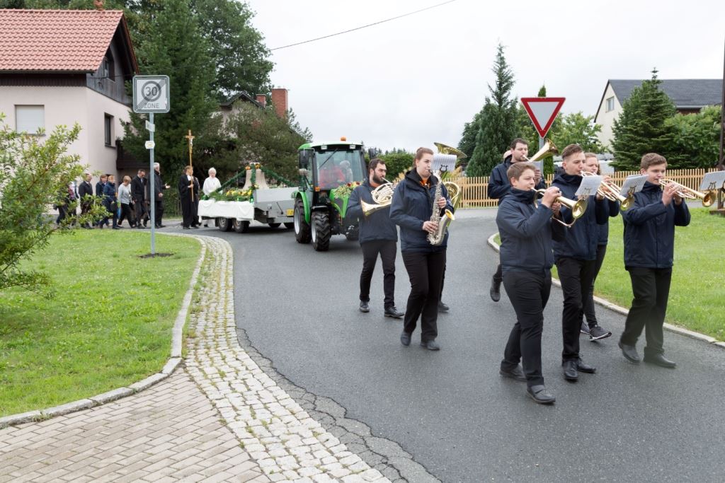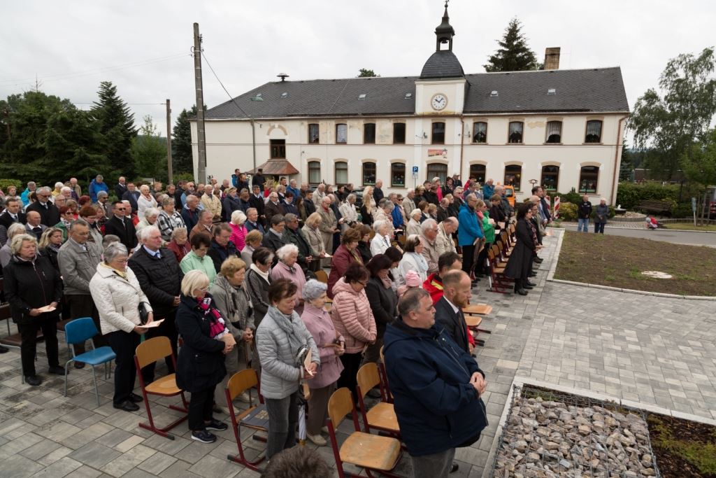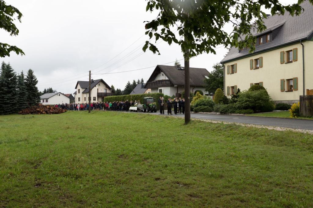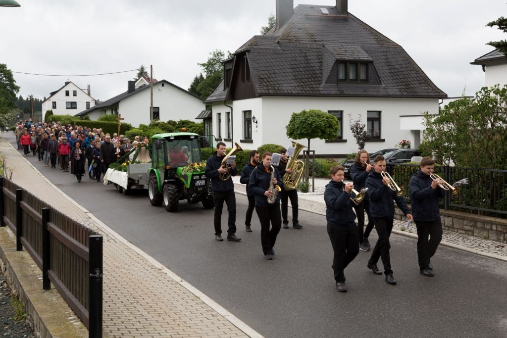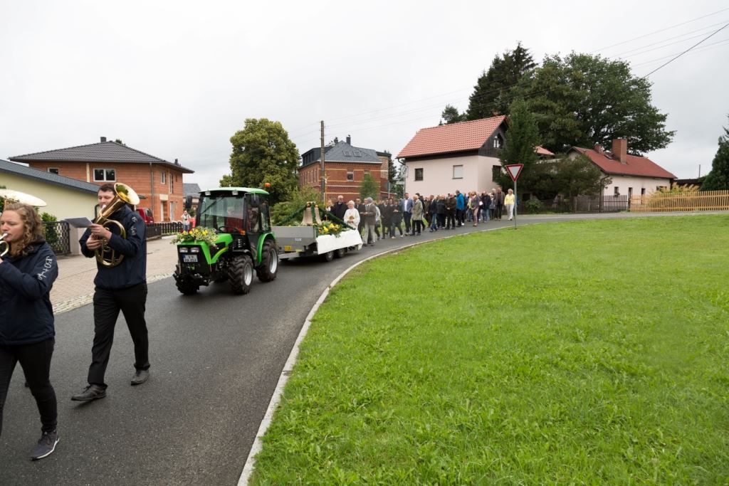 Am Sonntag, dem 24. Juni fand als Höhepunkt der Feierlichkeiten zum Partnerschaftstreffen ein Festumzug und Ökumenischer Open-Air-Gottesdienst mit Weihe der Beerheider Glocke statt. Betreiber dieser Glocke wird die Evangelische St.-Laurentius-Kirchgemeinde Auerbach sein. Ein herzlicher Dank geht an all diejenigen, die diesen Tag vorbereitet und durchgeführt haben; zu danken ist unserer Stadt Auerbach mit Stadtrat und Stadtverwaltung für die Unterstützung beim Bau und der Einweihung des Ortsplatzes, der Evangelischen und Katholischen Kirchgemeinde zu Auerbach mit Frau Pfrn. Dr. Schmutzler und Frau Mahler sowie dem Kirchen- und Posaunenchor unter Leitung von Herrn KMD Meier für die Ausgestaltung des Gottesdienstes, dem Jugendblasorchester Auerbach unter Leitung von Andreas Schmidt für die Mitwirkung beim Festumzug, den städtischen Mitarbeitern im Bauhof, dem Ordnungsamt und dem Bereich Marktwesen sowie allen im Vorfeld beteiligten Verwaltungsmitarbeitern- besonders im Bereich Bauwesen und Finanzen. Ein besonderer Dank geht an die zahlreichen ehrenamtlichen Mitstreiter, die aus Beerheide von der Kirchgemeinde und der Landeskirchlichen Gemeinschaft zusammen mit dem Ortschaftsrat diesen Festtag geplant, vorbereitet und gestaltet haben. Danke auch allen Besuchern, die als Gäste begrüßt werden konnten – so kamen neben den Freunden aus der Partnergemeinde zur Beerheider Ortsplatzeinweihung auch die vogtländische Bundestagsabgeordnete Yvonne Magwas, der Landtagsabgeordnete unseres Wahlkreises Sören Voigt, der Stellvertreter des Oberbürgermeisters unserer Stadt Auerbach Joachim Otto sowie mehrere Stadträte, Vertreter der Stadtverwaltung, des Kirchenvorstandes der St.-Laurentiuskirchgemeinde Auerbach, Mitglieder der Beerheider Vereine und Interessengemeinschaften und zahlreiche weitere Einwohner aus unserer Ortschaft sowie Gäste aus Auerbach und aus den Nachbargemeinden.