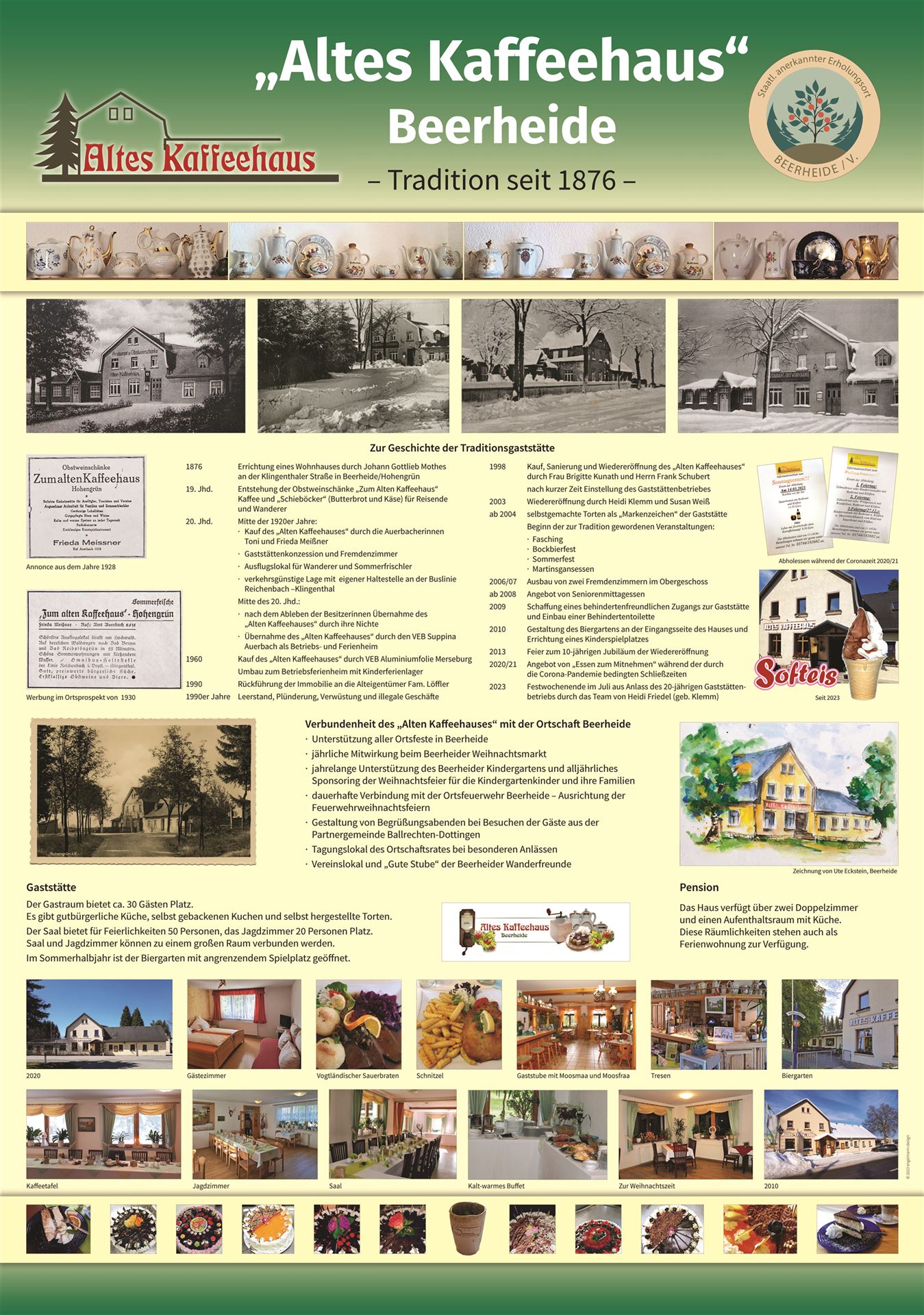 Schautafel zur Historie Altes Kaffeehaus, erstellt von der Beerheider Chronikarbeitsgruppe im Jahr 2023 aus Anlass des Jubiläums „20 Jahre Betreibung des Alten Kaffeehauses“, überreicht zum Bürgerfest 27.10.2023. Diese Schautafel ist im Informationsbereich zur Beerheider Ortschronik im Obergeschoss des Kulturhauses Beerheide einzusehen.