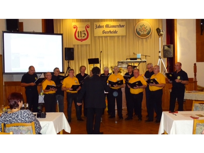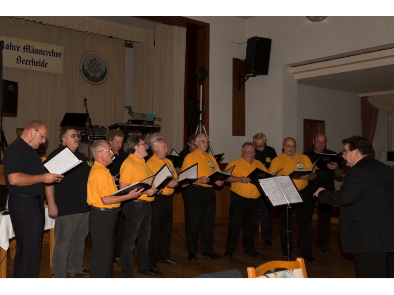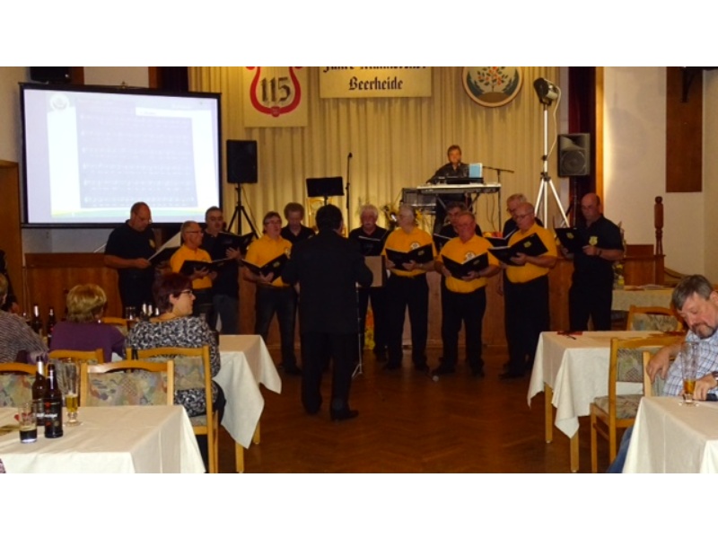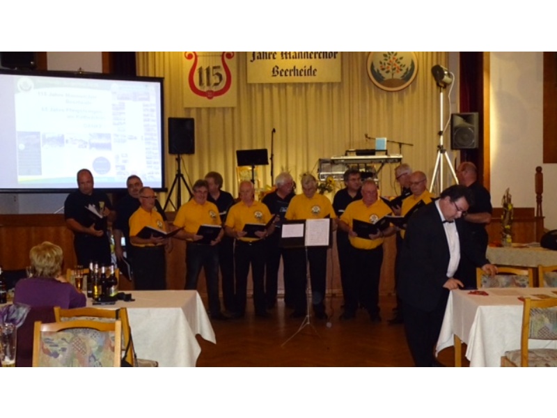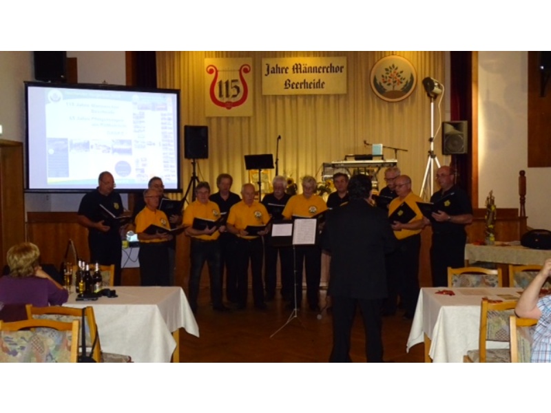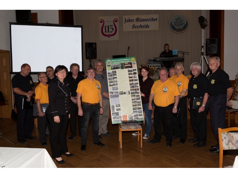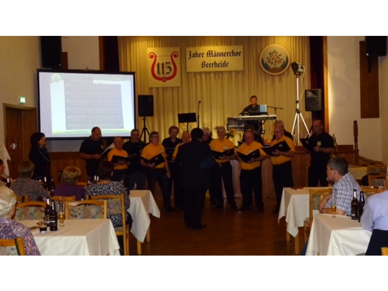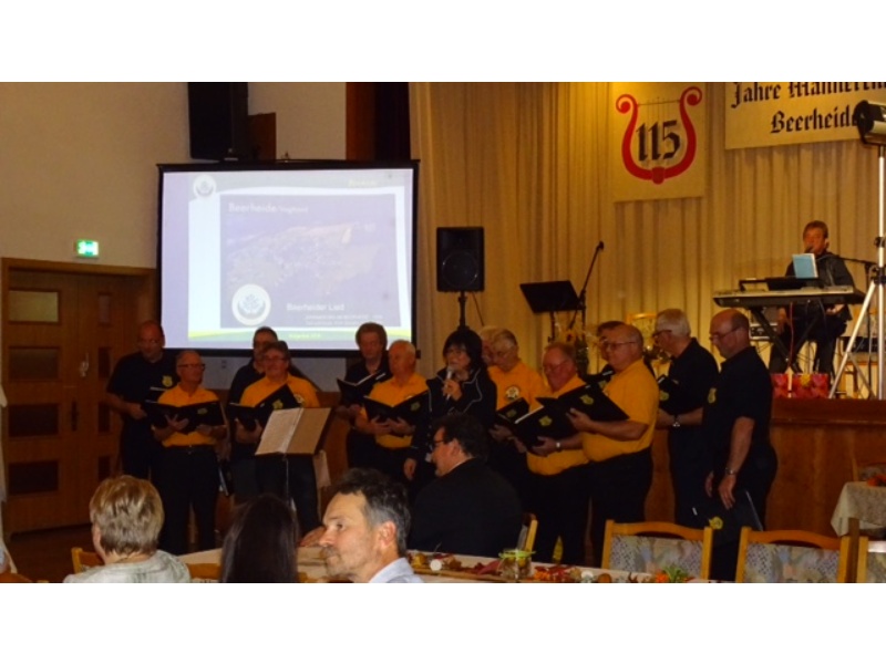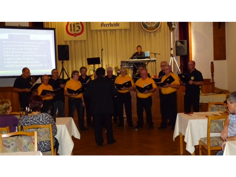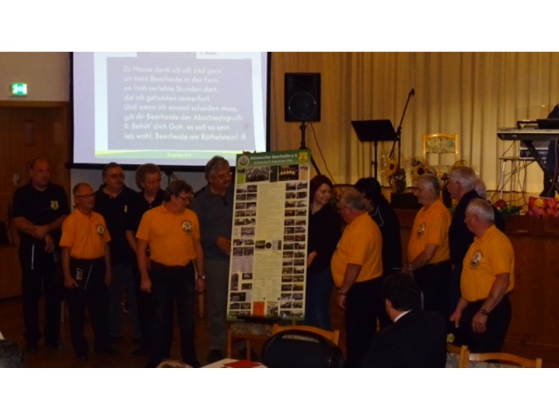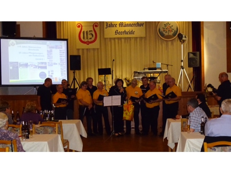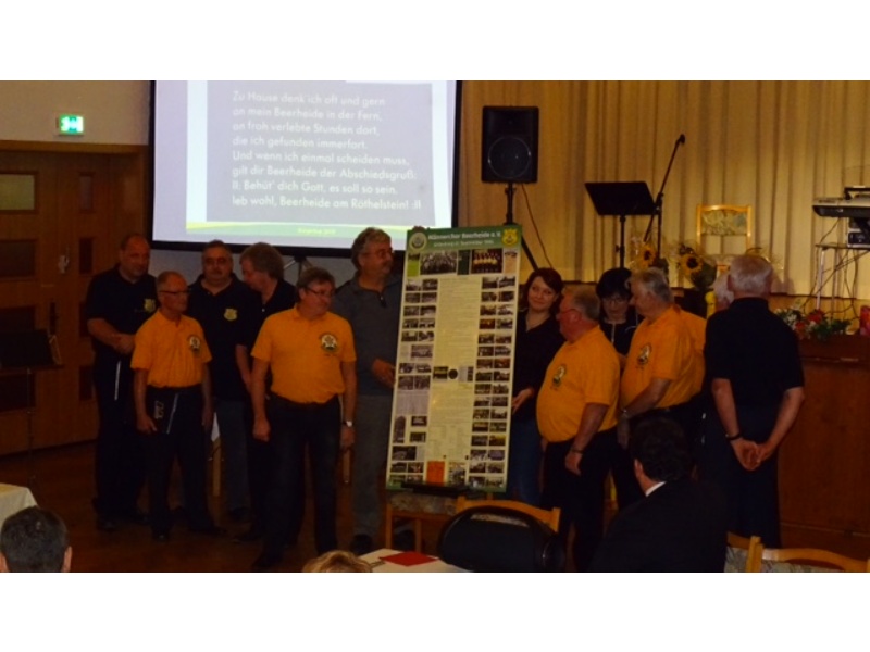 Die Ehrung der Sänger mit einer Chronik-Tafel war eingebunden in ein Programm des Chores. Es wurden 6 Lieder vorgetragen, darunter 2 Stücke mit Text und Musik aus der Feder von Günter Fischer. Dies sind die Titel „Am Röthelstein in Beerheide“ und „Heimat“, die auch als Liedpostkarten veröffentlicht worden sind. Alle weiteren 4 Lieder, die der Chor zu Gehör brachte, wurden von Günter Fischer speziell für den Beerheider Männerchor arrangiert, u.a. auch das „Beerheider Lied“.