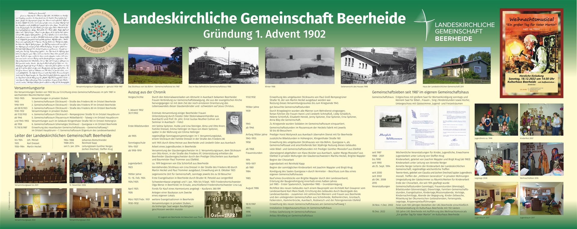 Schautafel zur Historie Landeskirchliche Gemeinschaft, erstellt von der Beerheider Chronikarbeitsgruppe im Jahr 2022 aus Anlass des Jubiläums „120 Jahre Landeskirchliche Gemeinschaft“, überreicht zum Bürgerfest 2022. Diese Schautafel ist im Informationsbereich zur Beerheider Ortschronik im Obergeschoss des Kulturhauses Beerheide einzusehen.